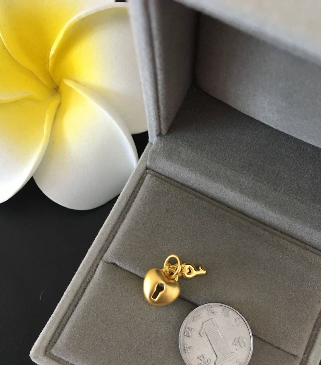 XY珠宝!999足黄金3D硬金立体磨砂心锁+钥匙吊坠