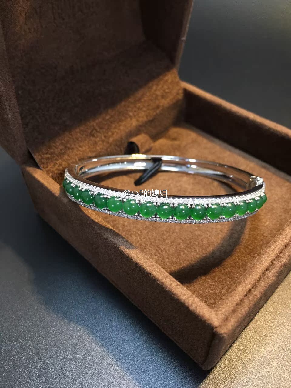 XY珠宝私人订制!18K白金冰种翡翠绿蛋钻石手镯 14手围及以下合适