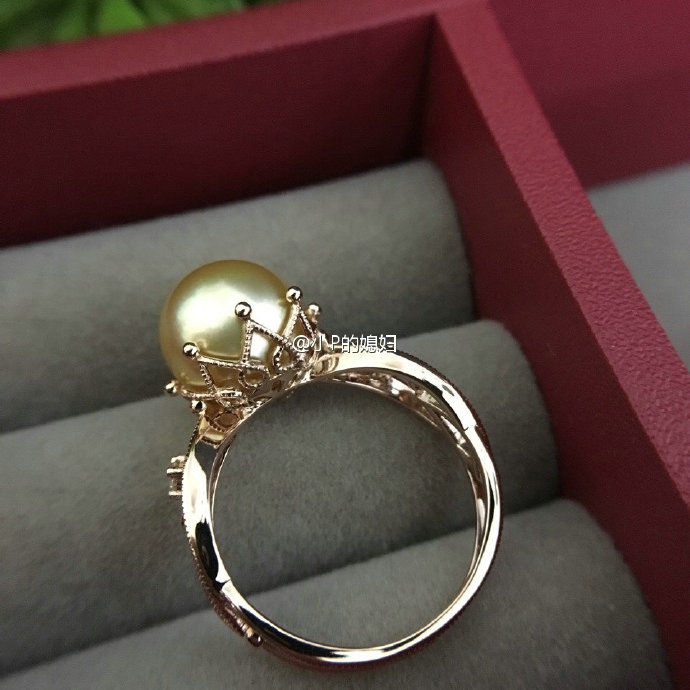 南洋金珍珠10.7mm,花丝皇冠橄榄通花戒臂款戒指