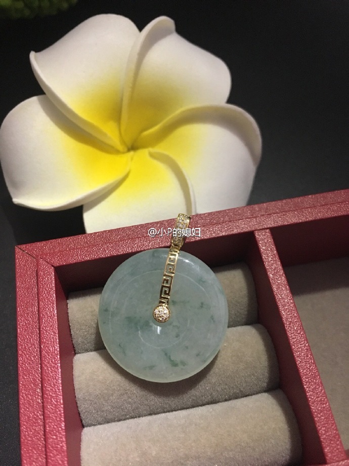 翡翠冰种碎花大平安扣,回型纹直身钻石扣