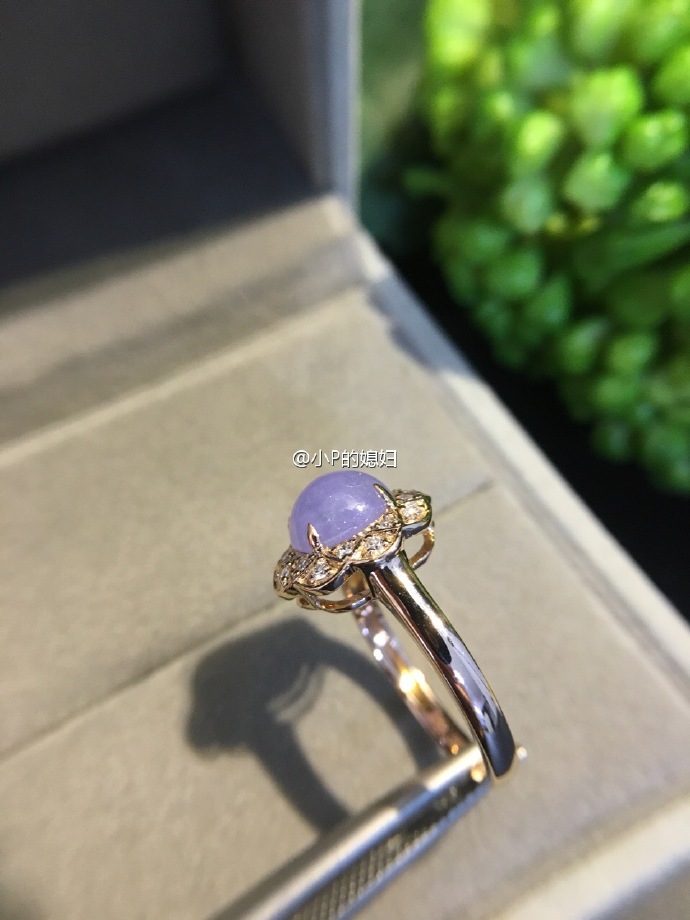 翡翠紫罗兰蛋面钻石戒指,星芒花型围钻配合直戒臂