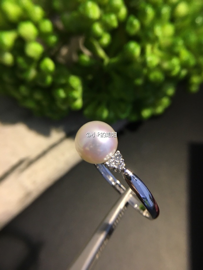 日本AKOYA海水珍珠,粉白单孔,做的左右三粒钻戒指用的是2份一粒的配钻,圆厚刀臂