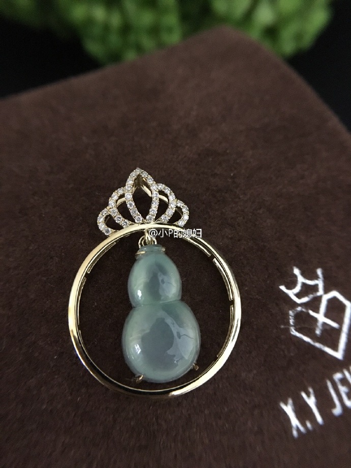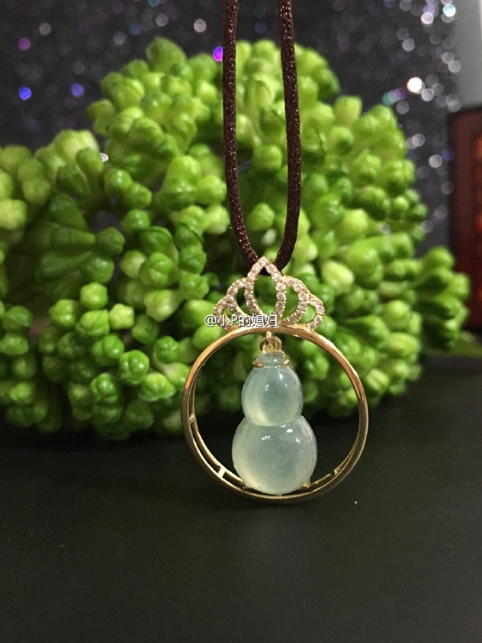 翡翠葫芦3号,皇冠圆环型吊坠,葫芦没有固定,在环中可以活动。满钻镶嵌的皇冠华丽大气,上身效果更是美丽,长短皆宜