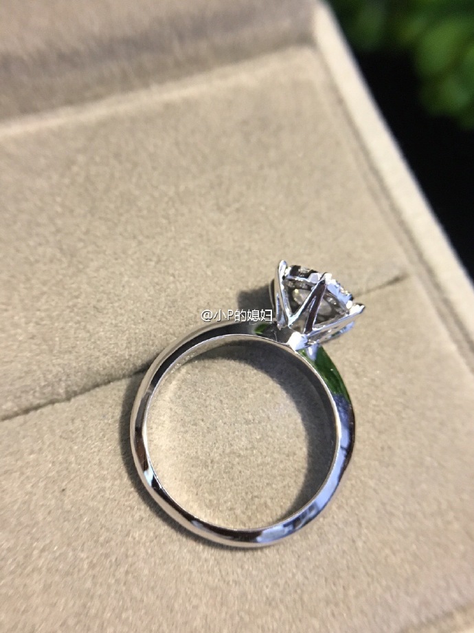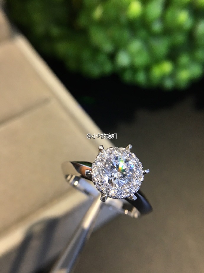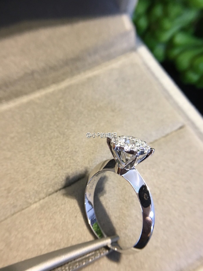 GIA祼钻,圆型47份,平面围钻加大视觉效果,用的是1.5份的钻,有1.2-1.5克拉的效果。T家经典六爪剑脊臂戒指9圈