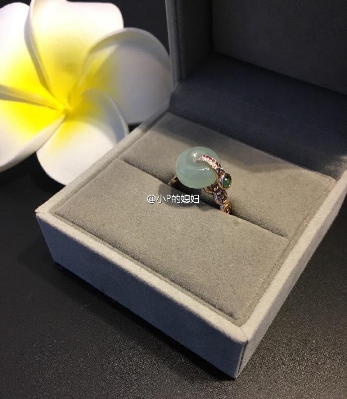 翡翠算盘珠平安扣,18K玫瑰金铜钱戒臂红宝石钻石配镶时来运转戒指